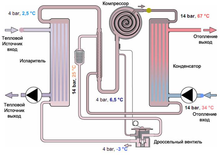Тепловий насос - це облаштування передачі теплової енергії від низької температури до більш високої температури. Принцип дії теплового насоса абсолютно ідентичний холодильнику. Тільки у холодильнику кінцевою метою є холод, який виходить за рахунок відбору теплоти з об'єму випарником. Конденсатор скидає теплоту в довкілля. А в тепловому насосі все відбувається навпаки. Конденсатор - це теплообмінник, який виділяє теплоту, а випарник - теплообмінник, який утилізує низьку температуру